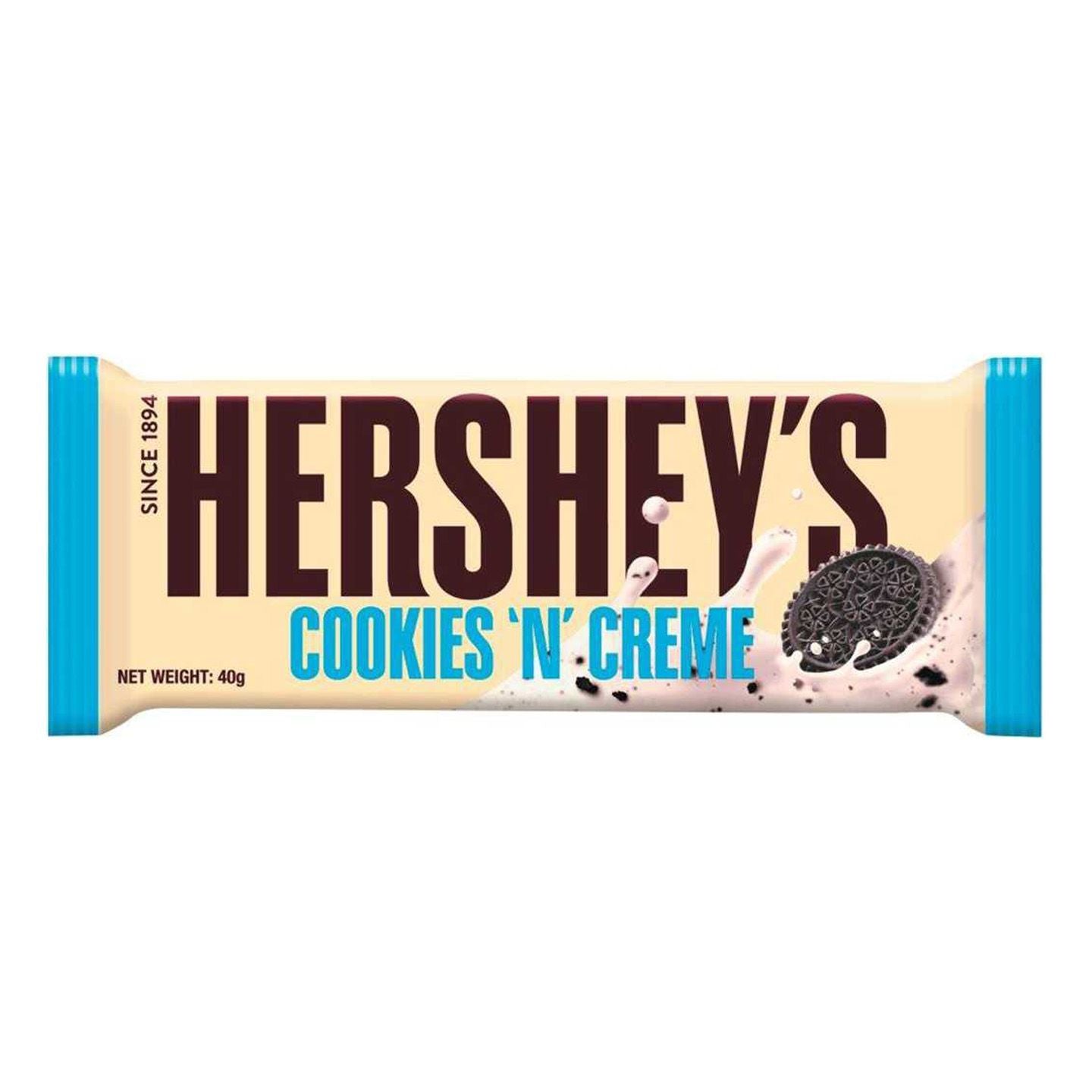 Grab yourself a bar of Hershey's Cookies & Cream today and experience total bliss! Classic Hershey's milk cream, with crunchy bits of cookie.